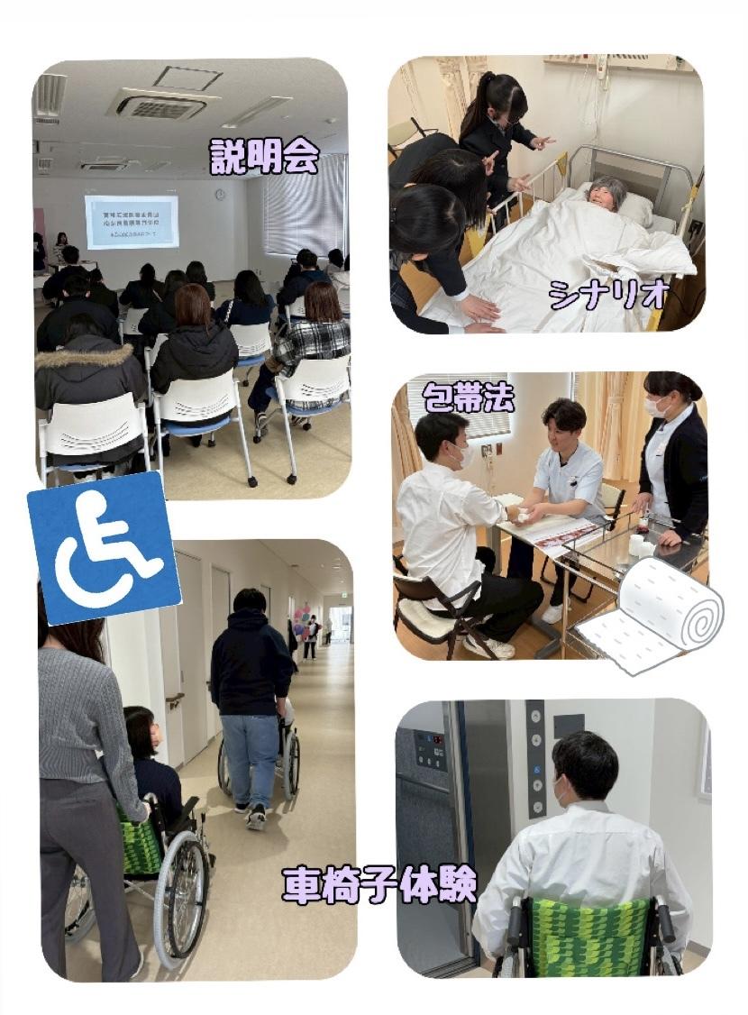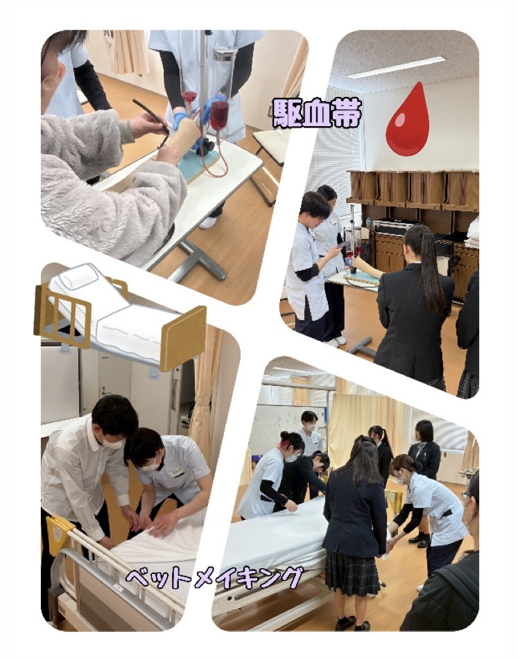 本校のオープンキャンパスではモデル人形を使用をした体験や妊婦体験、駆血帯体験などさまざまなブースを用意しました。また在校生との交流会や教員による相談会なども行いました。